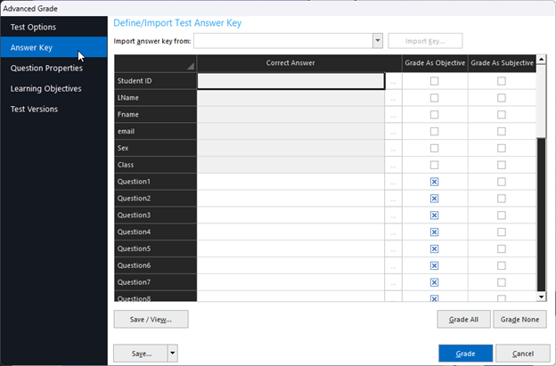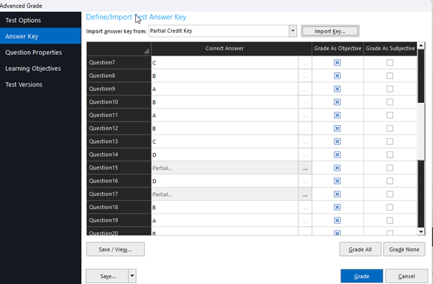 You can either select to Save your answer key or begin to Grade your test. If you did not save your answer key and select Grade, you will be given an opportunity to save your answer key or not to save your answer key.