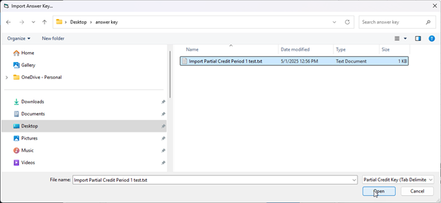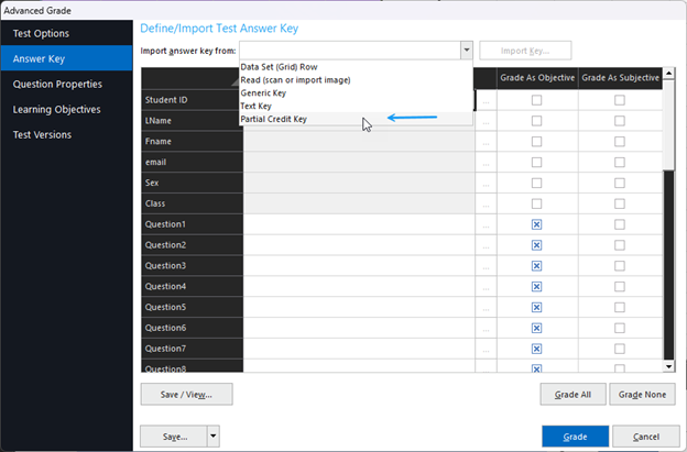 Select the drop-down to the right of Import answer key from and select Partial Credit Key.