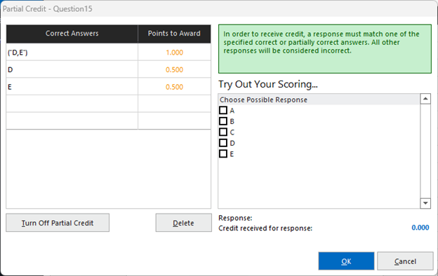 Note that you need to include all questions, answers, and point values in your import file and not just those for the partial credit questions.