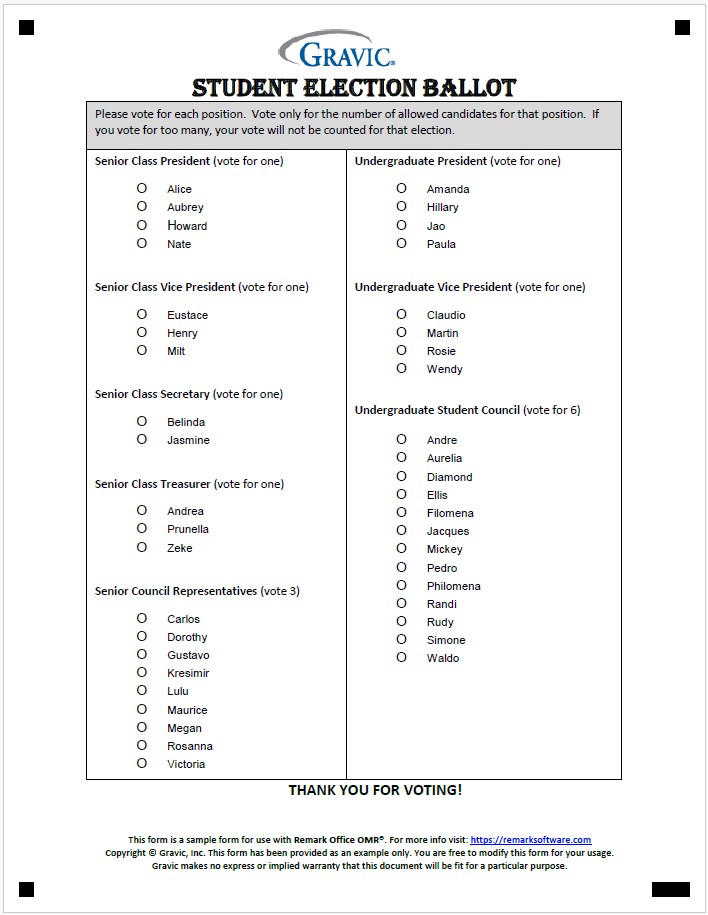This ballot can be used to elect members of student council. You may print blank copies of this form, have them filled in and scan with an image scanner, or upload the provided image files of pre-filled out forms if you do not have a scanner available. The Word document has been provided so that you may modify this form to meet your needs. Note that the Word document does not include the anchor marks (but the PDF does). Please note that once this form has been modified, the template must be modified as well. Download a free demo of Remark Office OMR to try it out for yourself.